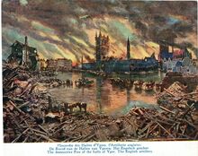l'Incendie des Halles d'Ypres. l'Artillerie anglaise. - De Brand van de hallen van Yperen. Het Engelsch geschut. - The destructive Fire of the halls of Yper. The English artillery