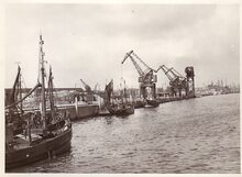 Zicht op de diepwaterkaai met 3 stukgoedkranen en de titankraan van 40 ton hijsvermogen,links aan het vlotdok hangaar 6 en een 7 ton kraan.