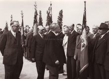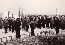 Minister Albert DEVEZE van landsverdedeiging in gesprek met een vaandeldrager van de opgestelde oudstrijdersvereniing. Achter de minister burgemeester Henri SERRUYS.
