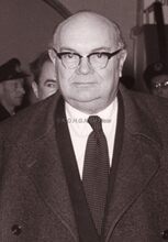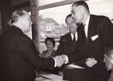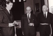 Théo LEFEVRE, eerste minister, tussen burgemeester Jan PIERS en schepen Kamiel DEHOUCK op het Oostends stadhuis.