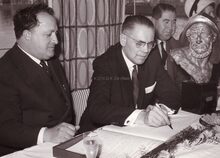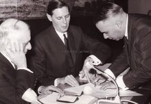 Jan PIERS, burgemeester, ziet hoe schepen Raymond MIROIR een document tekent, schepen Henri EDEBAU zit er ook bij.