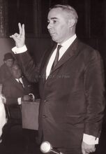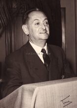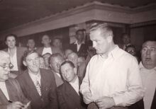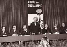 Socialistisch voorman Camille HUYSMANS, spreekt in zaal De Noordstar, naast hem Dirk VANDEPITTE, vroeg overleden socialistisch gemeenteraadslid. Uiterst links Willy CLAES en uiterst rechts John LAUWEREINS.
