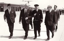 De minister van verkeerswezen, Alfred BERTRAND wordt rondgeleid op de luchthaven van Raversijde, toen nog op grondgebied Middelkerke. Links de burgemeester van Middelkerke. Op de achtergrond het luchthavengebouw in opbouw. Foto waarschijnlijk in de periode 1961-1965, toen de heer BERTRAND minister was van verkeerswezen.