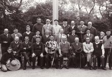 De schutters van Sint Sebastiaan op een koningschieting. De sire, Maurice Wandels zit centraal met de afgeschoten oppergaai. De jongen met de biezen hoed haald de afgeschoten pijlen op. Hun lokaal ligt aan de Leffingestraat.