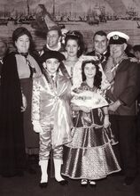 Plechtige ontvangst op het stadhuis. De prins en prinses en de jeugdprins en -prinses Albrecht en Isabella van Mariakerke 1965. Rechts achteraan, Norbert Van der Cruyssen voorzitter van o.a. het Mariakerks carnavalgebeuren en Grootmeester in de Orde der Sombrero's. Links, Meetje van de Koaje (Blanche Belpaeme) van de "Orde van de Kloeffe".