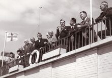 Jumelage van Oostende met Monaco.De genodigden op het balkon van het consulaat van Monaco in de Van Iseghemlaan eigendom van de familie PORTA . Derde van links, schepen Jozef VANDENKIEBOOM, dan Marie-Jozef PORTA, consul van Monaco en schepen, schepen Kamiel DEHOUCK, deken René BUTAYE, de burgemeester van Monaco de heer BOISSON. Vierde van rechts John LAUWEREINS, schepen.