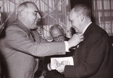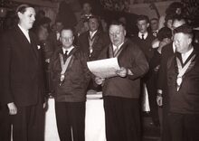 Jan PIERS overhandigt de stadspenning aan Théo LEFEVRE, eerste minister, bij diens ontvangst op het stadhuis.