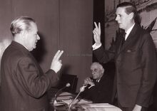 Schepen Jozef Van Den Kieboom wordt beëdigd door burgemeester Jan Piers. Zittend schepen Henri Edebau.