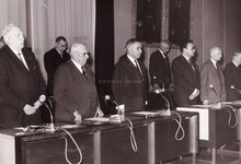 Er wordt een minuut stilte gehouden in de gemeenteraad.Op de eerste rij van links naar rechts Sebastiaan BOUDOLF, gemeenteraadslid, onbekende, schepenen Raymond MIROIR, Jan FELIX en Marie-Jozef PORTA. Op de tweede rij de gemeenteraadsleden Joseph VAN LANGENHOVE en Louis VANHOORNE