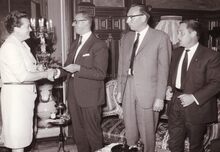 Burgemeester Adolf VAN GLABBEKE aan tafel met miss LIN JONG, hij heeft blijkbaar net een (Thais ?) ereteken ontvangen.