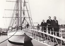 Burgemeester Jan PIERS met achter hem schepen John LAUWEREINs verlaten na een bezoekje de "Mercator".