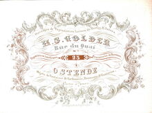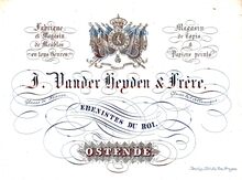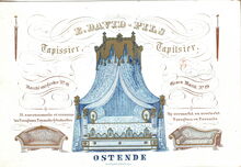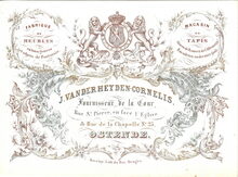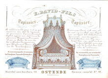 Formaat : 10,3 x 14 cm. - J. Van Der Heyden-Cornelis, Fournisseur de la Cour. Rue St Pierre en face l'Eglise & Rue de la Chapelle N° 23 Ostende. Fabrique de Meubles en tous genres et objets de Fantaisie. Magasin de Tapis, Glaces de France & de L'Allemange Encadrées au dernier goût..