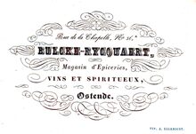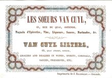 Formaat : 8,8 x 12,8 mm. - Les Soeurs Van Cuyl, 65 Rue de Quai Ostende. Magasin d'Epiceries, Vins, Liqueurs, Sauces, Marinades &c. 65 Quay street Ostend, Grocers and dealers in wines, spirits, cordials, sauces, preserves etc.