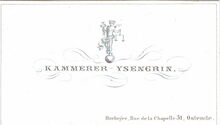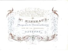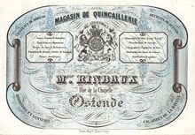 Formaat : 10,3 x 14,8 mm. - Magasin de Quincaillerie Mme. Rinbaux, Rue de la Chapelle Ostende. By apointmant. Christeaux de Boheme, Articles de Suisse, Brosserie et Ganterie, Cigarres de la Havane. Cannes, Parasole & Ombrelles, Boites de Spa et Parumeries, Fournitures de Bureaux, Articles de fantaisie, Plumes métaliques, Quincaillerie fine, franç & angl Nécessaires de voyage, Lithographies, Papéteries de luxe, Albums & Buvards, Encres de couleurs, Portefeuilles & agendas..