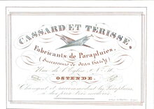 Formaat : 9,5 x 12,2 mm. - Cassard et Térisse, Fabricants de Parapluies, Rue de l'Eglise n° 36 Ostende. Kerke - straet. Changant et raccommodent les parapluies à des prix très modérés.