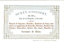 Formaat : 7,7 x 11,4 cm. - OCKET-GOSSAERT, Rue de la Chapelle à Ostende, Magasin de Lingeries, Dentelles, Broderies de Nancy, Garnitures en application de Bruxelles, Berthes, Cols, Echarpes, Mousselines, Batiste, Bas, Gants, Flanelles & Costumes de Bains.