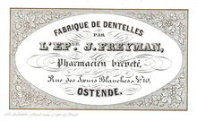 Formaat : 5,7 x 9,4 cm. - Fabrique de dentelles par L'EPse. J. FREYMAN. Pharmacien breveté, Rue des Soeurs Blanches n° 10 Ostende. - Lith. de Lestein, Fossés-au-loups, by Brux.