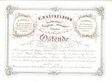 Formaat : 12 x 16 cm. - E. Raeckelboom, Ferblantier, Lampiste, Pomblier, Vitrier, Rue de la Chapelle n° 23A Ostende. Fabrique de toute Espèce de ferblanterie et d'ouvrages en Plomb et Carreaux à Vitres. Fabrique de Lampes ouvrages pour Batiment et de Cuisine. Tient magasin de lampes, entreprend les ouvrages de bâtiment et de fabrique en Zinc, Plomb, Ferblanc et Carreaux à vitres on trouve chez lui un bel Assortiment de Quincaillerie, Mercerie, Parfumerie, Jouets d'enfants, Verres et Mèches à quinquets de toutes qualités et revernit et remet les quinquets à neuf. Il se recommande à la bienveillance du public et assure un prompt et exact service.