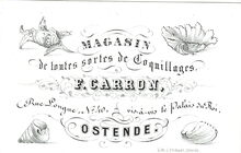 Formaat : 6,2 x 10 cm. - Magasin de toutes sortes de Coquillages, F. Carron, Rue Lonque N° 40, vis-à vis le Palais du Roi Ostende.