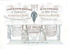 Formaat : 10,2 x 14,1 mm. - Atelier de teinture de graissage et lavage en neuf. Sur toutes espèces d'étoffes telles que Soieries, Laines & Cotons. Dépuelage des Soieries ..... Noir pour Deuil rendu dans les 24 heures. De Waele Rue d'Ouest N° 45 Ostende. Die and scour House, All sorts of Silk, Woollen and cotton Stuffs Washed like new Spots taken out of silks with the preservation of their primitive freshnes. Blach for mourning returned in 24 hours.