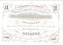 Formaat : 8,8 x 12,6 cm. - Changement de domicile Magasin de Chapelerie et de Casquetterie J.L.Coppin-Vandewinckel Chapelier. Ayant demeuré Rue du Lait Battu, vient de transferer son domicile Rue de la Chapelle 58 Ostende. Il se recommande aux personnes qui voudront bien l'honorer de leur confiance.