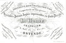 Formaat : 6,2 x 9,6 mm. - Spécialité pour Chapellerie fine Casquetterie en tous genres.Véritables Paletots Anglais imperméables en Gutta Percha. L.Hanze, Chapelier, 3 Rue de la Bride Ostende. Tricots et Robes pour bains confectionnés à volonté. Dentelles Valenciennes et Mouchoirs de Batisie. Etoffes diverses pour Robes. Passementeries. Cols & Bretelles. Applications et Broderies Anglaises en tous genres.