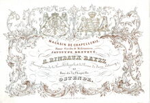 Formaat : 9,7 x 15,1 cm. - Magasin de Chapellerie pour Civils & Militaires jayotype breveté. A.Rinbaux-Rayez, 17 Rue de la Chapelle Ostende. Fournisseur de la Famille Royale & du Prince de Saxe Cobourgs.
