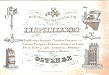 Formaat : 8,8 x 12,8 cm. - J.J.Spilliaert, Rue de la Chapelle N° 6.Ostende. Ferblantier, Lampiste, Plombier, Couvreur en Ardoises, Pompier & Fontainier Etameur sur Cuivre, Fer de Fonte & Battu, Baignoires, Seringues Clyssopompes & Clissoirs.