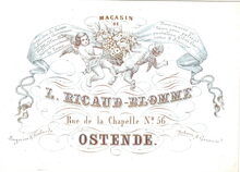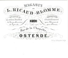 Formaat : 8,2 x 11,5 mm. - Magasin de Draps, Cuir, de Laine, Cachemirs, Castorines, Duffles, Flanelles, Couvertures de Laine. Nouveautés en laine pour paltau pantalons, gilets, cravattes & soieries. Lingeries & Foulards. Rubans & Ganterie, L.Ricaud-Blomme, Rue de la Chapelle N° 56 Ostende.,