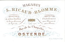 Formaat : 6,2 x 10 cm. - Magasin de Draperie & autres étoffes de Laine. Soieries de Lyon etc..Confection d'habillement pour Hommes et pour Dames. L Ricaud-Blomme, Rue de le Chapelle N° 56 Ostende.