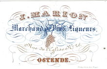 Formaat : 7,2 x 11 cm. - J. Marion. Marchand de Vin & Liqueurs. Rue de l'Eglise N° 26. Ostende.