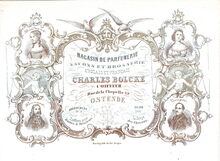 Formaat : 10,5 x 14,2 mm. - Magasin de parfumerie, Savons et Brosserie, Anglais et Français, Charles Bolcke Coiffeur, Rue de la Chapelle N°49 Ostende. Abonnement de la coiffures pour Dames et Messieurs. Salon pour la coupe des cheveux. Bandeaux. Perruques. Toupets. Tours.