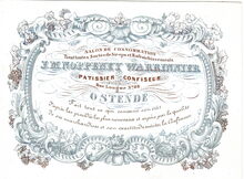 Formaat : 10,2 x 13,7 cm. - Salon de consommation. Tient toutes Sortes de Sirops et Refraichissements. J.M.Noppeney Warrinnier, Patisier Confiseur, Rue Longue N°68 Ostende. Fait tout ce qui concerne son étât d'après les procédés les plus nouveaux et espère par les qualité de ses marchandises et son exactitude mériter la Confiance.