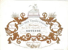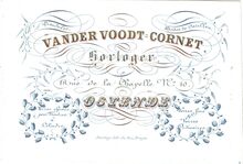 AFormaat : 10,7 x 14,5 cm. - Vander Voodt-Cornet. Horloger. Rue de la Chapelle N°54, Ostende. Magasin de Pendules. Horloges de Cuisine. Boites à Carillon. Verres chèvés pour montres à Cylindre. Verres fins et ordinaires pour Montres. .