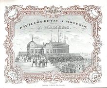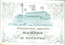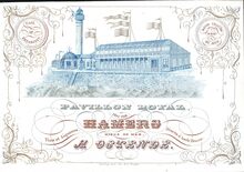 Formaat : 11,8 x 17 cm. - Pavillon Royal tenu par Hamers, Digue de mer a Ostende. Café et Estaminet. Bains chauds D'Eau de Mer. Vins et Liqueurs. Diners à toute Heure. blauw en goud ingekleurd