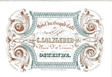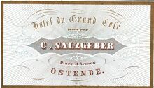 Formaat :Β 7 x 11,6Β cm.Β - Hotel du Grand CafΓ© tenue par C. Salzgeber sur La Place d'Armes Γ proximitΓ© de la Digue de Mer Γ Ostende. Table d'HΓ΄te de 1 Γ 5 heures. Diners particuliers Γ toute heure.