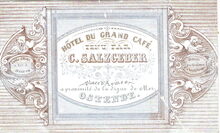Formaat : 4,9 x 8,8 cm. -Β Hotel du Grand CafΓ© tenu par C.Salzgeber sur la Place d'Armes Γ Ostende.Β Het hotel was gelegen op de hoek van de Apenstraat (huidige Brabantstraat) en de Comediestraat (huidige Louisastraat