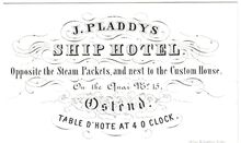 Formaat : 5,1 x 8,5 cm. -Β J.Pladdys. Ship Hotel. Opposite the Steam Packets, and nest (sic next)Β to the CustomΒ House. On the quai Nr 15 Ostend. Table d'hΓ΄te at 4 o'clock. Β Het hotel was gelegen Visserskaai 15.