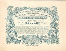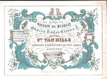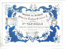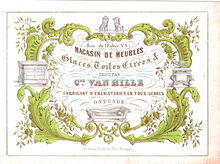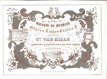 Formaat : 10 x 13,6 cm. - Magasin de Meubles, glaces, toiles cirΓ©es etΒ fabricant d'Γ©bΓ©nisteries en tous genres tenu par Chs.Β Van Hille,Β Rue de l'Eglise nΒ° 8 Γ Ostende. Blauw ingekleurd.