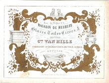 Formaat : 10 x 13,6 mm. - Magasin de meubles, glaces,  toiles cirées,  fabricant d'ébénisteries en tout genres tenu par Chs. Van Hille,  Rue de l'Eglise n° 8 à Ostende. Goud ingekleurd.