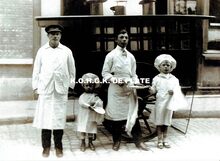 Formaat : 20 x 27 cm. - Frietkar voor Dancing Valentino op de Groentemarkt. - We zien helemaal links Eduard Geselle, rechts naast hem RenΓ© Geselle, dan Georges Geselle die later uitgeweken is naar de Verenigde Staten en rechts van hem Camiel Geselle