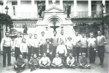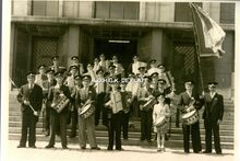 Afdruk. - Het accordeonorkest "Ons Achturenhuis" op de trappen van het Gerechtshof, toen dienstdoend stadhuis, na een plechtige ontvangst