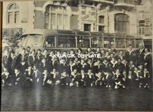 Groepsfoto van de "Blauwe Vlinders, een liberale jeugdafdeling voor een autocar aan het Prinses Clementinaplein en Koninginnelaan voor villa Adolphine. Helemaal rechts, de voorzitterΒ Maurice Quaghebeur senior. Zij gingen op reis naar de Expo 58