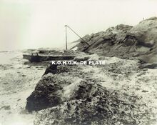 Formaat : 14 x 19,5 cm. - Twee baggermolens met bijhorende slijkbakken zijn in volle bedrijvigheid om de drie nieuwe aanlegplaatsen voor de pakketboten achter het eerste zeestation op diepte te brengen in 1888 (R. A. Brugge. Kaarten en Plannen, nr. 106)
