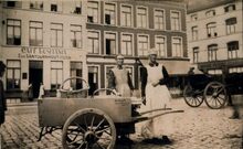Afdruk. - De Visserskaai tussen het Vissersplein (links) en de Nieuwstraat (rechts). Vooraan de viskar van visverkoopster weduwe Majoor. Op de achtergrond "CafΓ© Kusitania" uitgebaat door Emile Vantournhout-Ostin. - Map 023 B-53