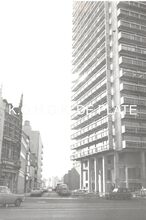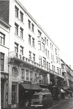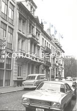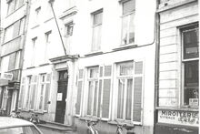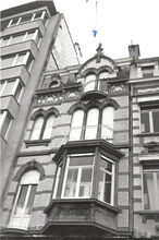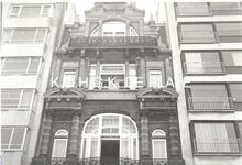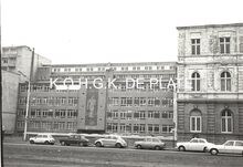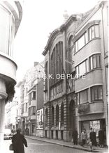 Formaat 8 x 12 cm. - Hoofdgebouw in de Troonstraat, met centraal de reliΓ«fvoorstelling βDe Zaaierβ door Jo Maes
