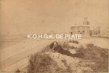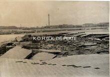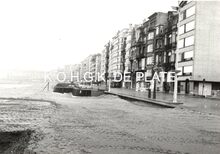 Formaat : 12,5 x 17 cm. - Een beschadigde Zeedijk met daarachter het Klein Strand en Weststaketsel. In de achtergrond een zicht op de Oosteroever met Vuurtoren Lange Nelle