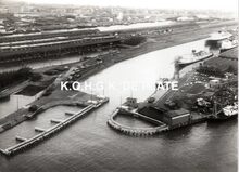 Formaat : 13 x 17,5 cm. - Luchtfoto. - We zien het Zeewezendok met enkelvoudigeΒ sluis. Rechts een gedeelte van de werkhuizen van het Zeewezen.Β Het Tijdok met de Stedelijke Vismijn enΒ het Visserijdok. Op de achtergrond de Vuurtorenwijk