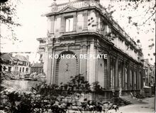 Foto : 12,5 x 17,5 cm. - Het vernielde postgebouw in de Hendrik Serruyslaan. Rechts, de Poststraat.