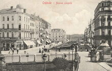De Zeedijk met op de hoek vanΒ de Louisastraat het Majestic Palace Hotel. Vooraan op de hoek vanΒ de Vlaanderenstraat, detail van het Thomas Cook reisbureau.